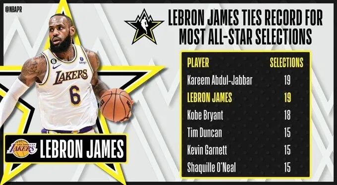 ,這是詹姆斯第19次入選,追平賈巴爾並列成為NBA曆史上入選全明星次數最多的球員 。同時也是他連續第六年當選隊長,排名第二的是科比
