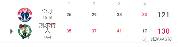 末節之爭,奇才一波19-6讓他們重燃逆轉希望,但布朗關鍵時刻打成兩記2+1殺死比賽。最終,凱爾特人130-121輕取奇才拿下比賽。
